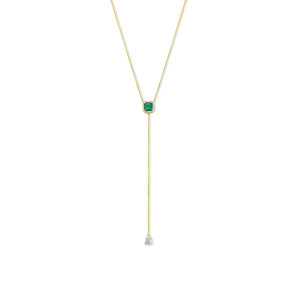 Your eye is first drawn to the heart of the piece: a 0.70-carat natural emerald. Its deep, velvety green is a true gift from the earth, full of character. We framed it in a sparkling halo of bright, lab-grown diamonds to make its color sing. From this vibrant center, a delicate 14K gold chain drops to a magnificent 0.50-carat pear-shaped lab diamond. This diamond is high quality, with a VS clarity and G-H color, ensuring a breathtaking sparkle with every move.