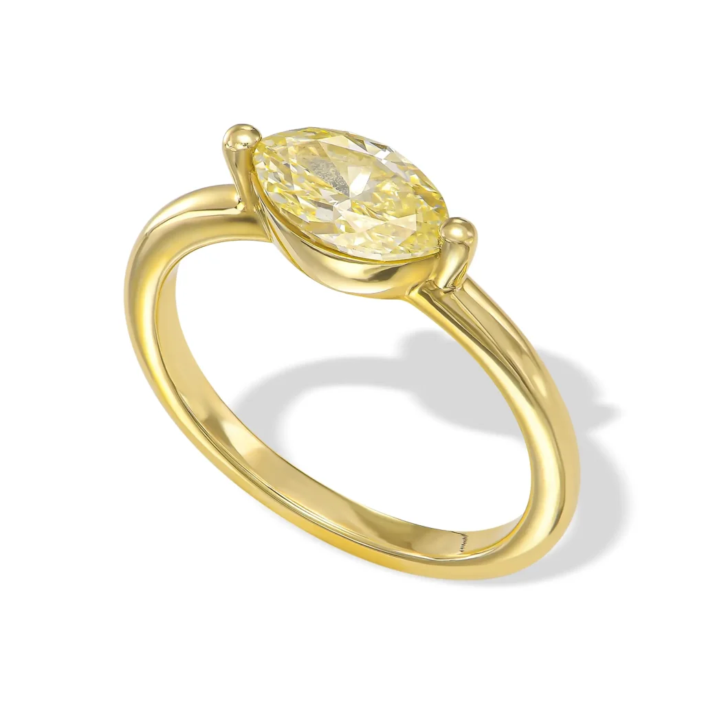 This ring showcases a substantial 0.80-carat marquise-cut diamond. Its elegant, elongated shape is incredibly flattering on the hand. This is a natural diamond with a beautiful, certified Fancy Yellow color. It radiates a warm, vibrant energy, like a drop of captured sunlight at your fingertips. A high VS clarity grade ensures the stone has a beautiful and clean appearance, free of distracting inclusions.