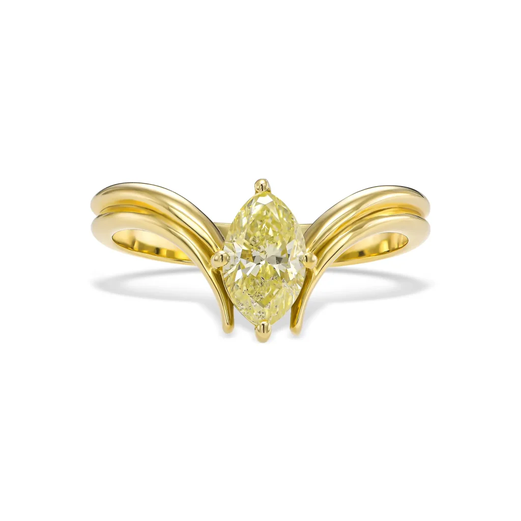 The polished gold band separates into two distinct stripes. These golden ribbons flow asymmetrically, sweeping up to cradle the center diamond in a secure and stylish embrace. Held within this unique setting is a 0.80-carat marquise-cut diamond. As a natural stone, it possesses a wonderful Fancy Yellow color, bringing a bright and optimistic energy to the design. Its SI2 clarity is part of its natural character, a fingerprint from its journey within the earth.